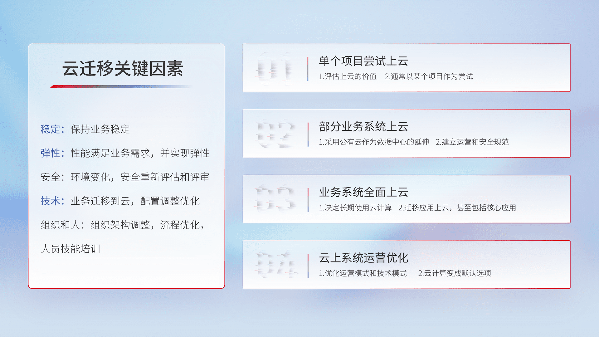 结合实际业务,,从规划设计、、、、云平台选型、、、云原生改造、、数据迁移、、集成交付,,,,迁移全过程为客户识别最佳上云路径,,做好风险识别管理,,,,设计网络架构、、、、身份权限、、、安全审计合规、、、、操作审计、、、、日志审计、、监控告警策略、、多站点容灾设计等,,对云上基础设施进行整体规划,,,提升IT治理水平,,,以满足弹性、、、、高可用、、高性能的需求。。。