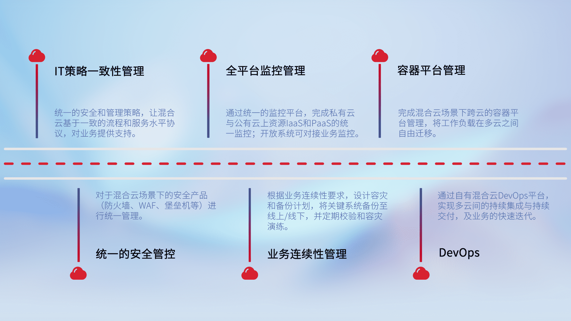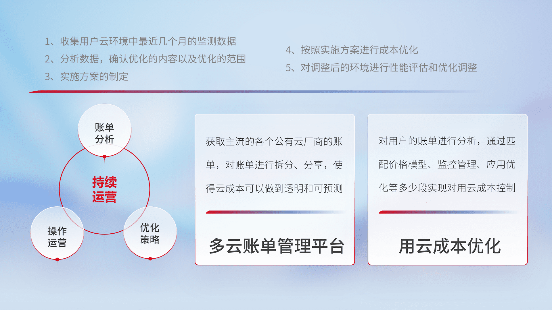 通过多云纳管,,,,以统一的资源数据模型把客户的云资源进行抽象和封装,,进而实现对多云资源的统一操作,,保障云资源管理的可靠性、、、、稳定性与可用性。。量身定制化运维内容,,配置、、、开发运维、、补丁管理、、、备份、、、、监控、、、认证和访问管理、、审计和日常巡检等,,保障在用云过程中的可靠度,,稳定度以及高可用率。。。。
